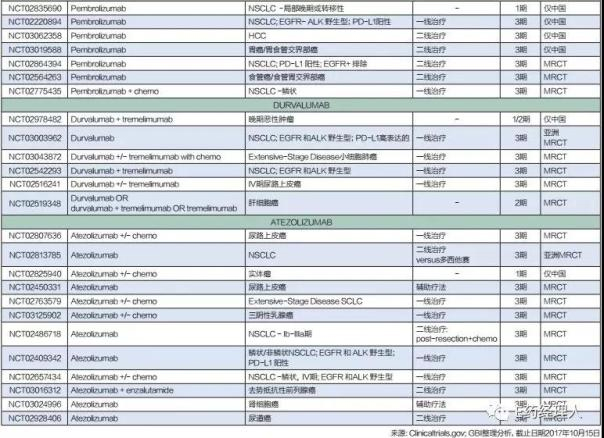 中国药物审评审批的因素也使得阿斯利康和罗氏公司的PD-L1抑制剂durvalumab和atezolizumab追赶了上来。 阿斯利康正在充分利用其CTLA-4抑制剂tremelimumab的优势,在durvalumab的9项公开登记的临床试验中,有7项都有tremelimumab的参与。