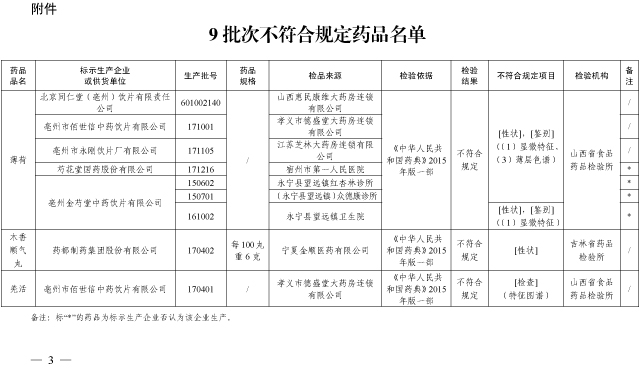 5月24日,国家药监局发布《关于9批次药品不符合规定的通告(2018年第29号)》。经山西省食品药品检验所等2家药品检验机构检验,标示为北京同仁堂(亳州)饮片有限责任公司等6家企业生产的9批次药品不符合规定。详情如下: