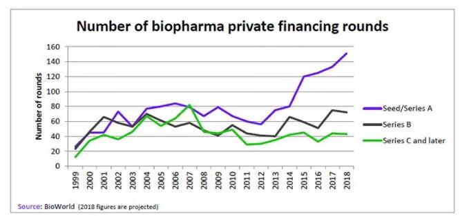 早期阶段投资额上行,首先表明对押注于已证实的科技创新的传统投资模式的扬弃,虽然在获得A轮融资的公司中,并非全都是开展早期科技研发。然而不容忽视的是,跨界公共投资者、大型生物医药公司的风投机构以及亚洲风投基金,还有家族理财,已将目光聚焦于新生科技密集型公司,尤其是在肿瘤免疫治疗领域。