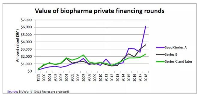 根据BioWorld的统计数据,2018年5月份还未过完,投资者已经“砸”向生物医药公司种子轮和A轮资金达到26亿美元,超过去年全年生物医药公司种子轮和A轮融资总额。如果保持这一节奏,生物医药公司种子轮和A轮融资全年有望超过60亿美元,比此前最高的2015年和2016年均融资额增长了一倍多。