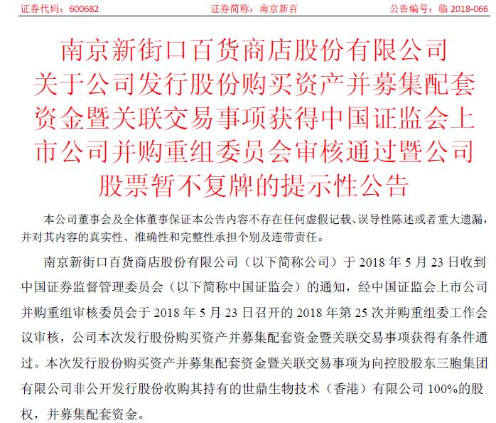近日,南京新百发布公告称,公司发行股份收购世鼎香港并募集配套资金的事项获证监会上市公司并购重组审核委员会审核通过,具体来讲,南京新百将以33.11元的价格向控股股东三胞集团发行1.8亿股,以59.68亿元向控股股东三胞集团收购其持有的世鼎香港100%股权,而世鼎香港的主要经营性资产为美国生物医药公司Dendreon,这意味着南京新百通过此次收购将成功把美国FDA批准的首个治疗前列腺癌且也是唯一的细胞免疫治疗药物Provenge(普列威)收入囊中。