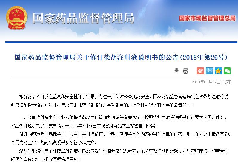 昨日(5月29日),国家药监局发布《关于修订柴胡注射液说明书的公告》称,根据药品不良反应监测和安全性评价结果,为进一步保障公众用药安全,决定对柴胡注射液说明书增加警示语,并对【不良反应】【禁忌】【注意事项】等项进行修订,其中,值得注意的是,在【禁忌】项中,明文列出“儿童禁用”,此外,“对本品或含有柴胡制剂及成份中所列辅料过敏或有严重不良反应病史者”也禁用。同时,对老人、孕妇、肝肾功能异常患者等特殊人群和初次使用中药注射剂的患者应慎重使用,加强监测。