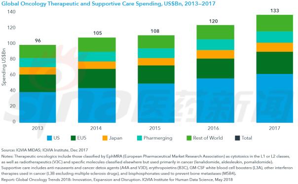 全球癌症药物支出(包括治疗性药物和支持性护理药物)在2017年为1330亿美元,2013年为960亿美元。支出增长继续集中在主要的发达市场,美国、欧盟5国(德、英、法、意、西班牙)及日本在2017年占全球市场的74%,略高于2013年的72%。