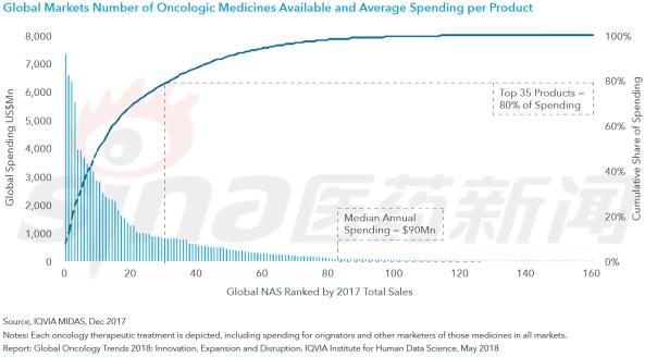 癌症药物的支出主要集中在少数药物上,销量排名前35的药物约占总支出的80%,超过一半的癌症药物年销售额不足9000万美元。在过去10年来,新推出的癌症药物价格稳步上升。例如,美国2017年上市的癌症药物中位年治疗成本超过15万美元,相比之下,2013年新上市的癌症药物的中位年治疗成本仅为7.5万美元。大多数癌症药物(包括年治疗成本较高的药物)被相对较少的患者群体使用;据估计,在2017年,有87%的肿瘤学药物治疗的患者人数少于10000例。
