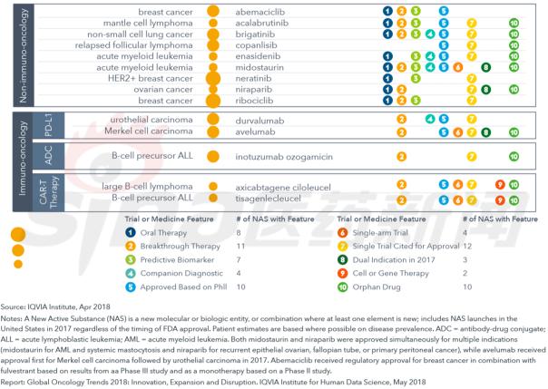 仅2017年就有14种新的活性物质(NAS)抗癌药上市,所有均为靶向疗法,其中11个获得了美国FDA的突破性药物资格,这些药物代表了显着的临床进步,并促进了横跨一系列肿瘤和机制中患者的总体生存。14种NAS中,6种是生物制剂(包括2种CAR-T疗法),7种与预测性生物标志物相关。