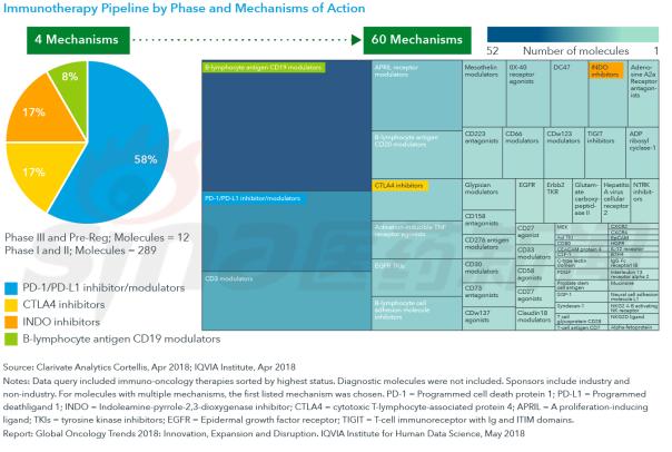 新药研发方面,免疫疗法管线特别活跃,多达300个具有60种独立作用机制的药物分子正在I期或II期临床阶段,被测试针对27种不同类型肿瘤,表明这种新方法在癌症治疗领域具有广泛应用的潜力。