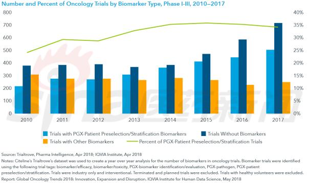 在2017年开展的肿瘤学临床试验中,有34%的使用生物标志物对易感患者进行分层,这意味着在未来将有更多的个性化癌症治疗药物。