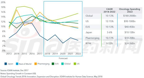 在美国,2013年癌症药物支出380亿美元,约占全球市场的39%,2017年上升到610亿美元,约占全球市场的46%,其中2/3增长与过去5年新上市的抗癌药有关,这些药物的支出在2022年预计将翻倍。在美国以外市场,2017年癌症药物支出超过600亿美元,主要是由新产品的上市及现有品牌药使用的增加所驱动。