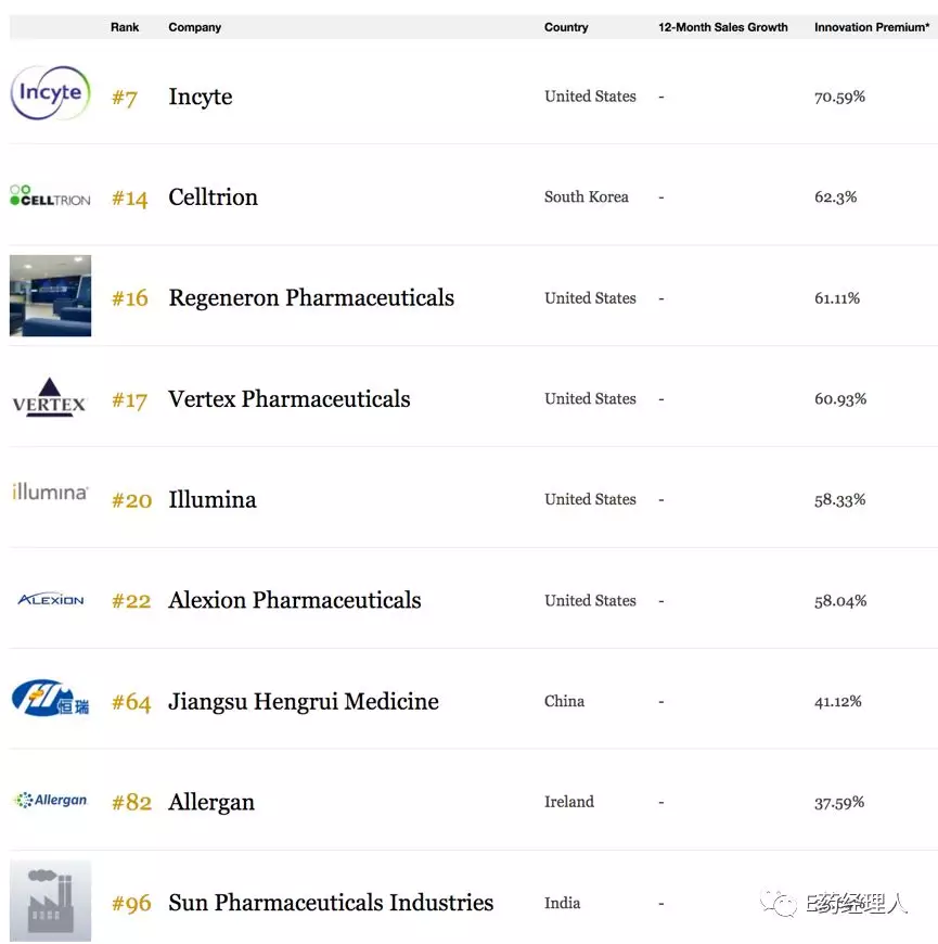 对于恒瑞来说,其能够同类似于Regeneron(再生元)、Incyte这样国际公认的创新型制药企业,以及Amazon(亚马逊)、Tesla(特斯拉)这样众所周知的明星公司一同入榜,无疑是外界对于其创新能力的一种极大认可。在福布斯最具创新力企业榜单的排名中,恒瑞医药的创新溢价为41.12%,而全球一共入围的九家制药企业中,美国的Incyte创新溢价居首,为70.59%,再生元则为61.11%。