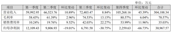 其中,公司四个季度营业收入分别为6.00亿元、6.65亿元、7.24亿元、10.53亿元,归属于上市公司股东的净利润分别为1.21亿元、0.98亿元、0.68亿元、0.23亿元。四个季度的净利润下降确实明显。(如下图)