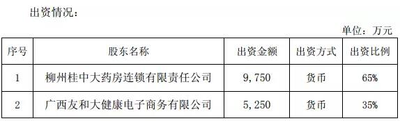 6月3日晚,广西柳州医药股份有限公司发布公告,其下属全资子公司柳州桂中大药房连锁有限责任公司与广西友和大健康电子商务有限公司共同出资设立广西新友和古城大药房有限责任公司(暂定名,以工商部门核准的名称为准,以下简称 “目标公司”),目标公司注册资本为人民币 15,000万元,柳州桂中大药房拟以现金出资 9,750 万元,占目标公司注册资本的 65%。