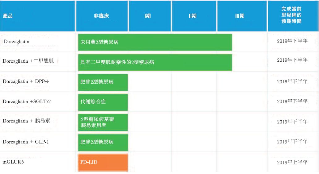 华领医药用于治疗2型糖尿病的全球首创新药口服药物Dorzagliatin是一种葡萄糖激酶激活剂或GKA,旨在通过恢复2型糖尿病患者的葡萄糖稳态平衡来控制糖尿病的渐进性退行性特征。目前该产品正在中国进行两项Ⅲ期临床试验,其中Dorzagliatin既作为单药疗法,亦与二甲双胍联合使用,预计2018年完成在中国的Ⅲ期临床试验的患者登记,并于2019年下半年发布临床试验结果,此后计划在中国提交Dorzagliatin作为1类新药的申请,并在2020年之前获得国家药品监督管理局的批准。华领医药的研发管线还包括评估Dorzagliatin与其他获批的2型糖尿病治疗方法的组合。