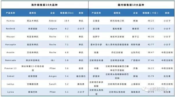 2017年,海外销售前十大品种中有8个是生物药,包括单抗、疫苗和胰岛素等,主要针对类风湿关节炎、肿瘤、肺炎和糖尿病等适应症,产品的治疗适应症明确,且为治疗的一线用药。