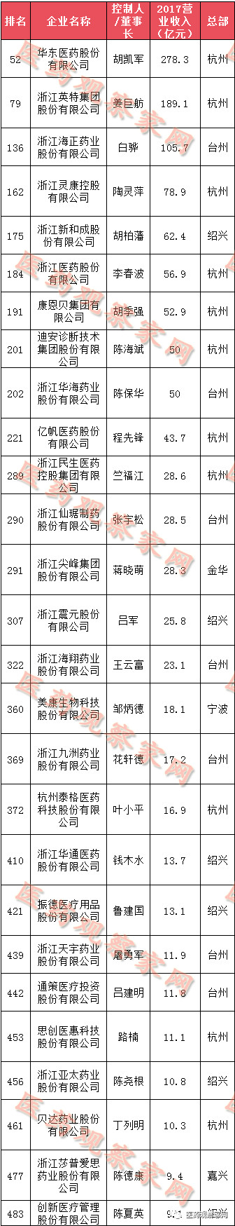 据医药观察家网不完全统计,医药行业共有27家药企入选,排名第一的是华东医药股份有限公司,其2017年营收为278.3亿元,总排名52名;其次为浙江英特集团股份有限公司,营收为189.1亿元,总排名79名;第三名为浙江海正药业股份有限公司,营收为105.7亿元,总排名136名。