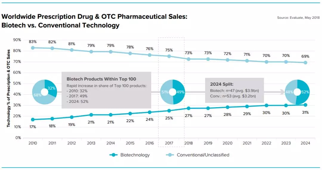 EvaluatePharma报告显示:生物制品的市场销售额日益增大,将从2017年的25%上升到2024年的31%。尤其是,2024年TOP100处方药产品,生物制品将从2017年的49%上涨到2024年的52%。这种增长趋势,促使越来越多的企业开发生物制品。