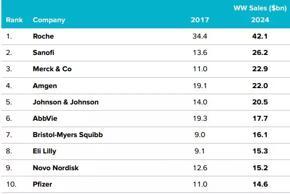 2024年,罗氏的生物制品销售额将达421亿美元(占总收入83%),毫无悬念成为生物制品销售最大的赢家,也再次凸显罗氏通过收购生物技术先驱基因泰克和持续投资生物技术产品而获得的长期价值。