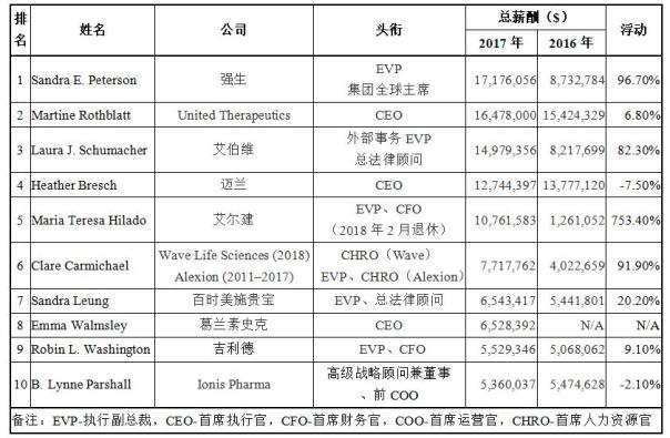 近日,GEN网站评选出了生物制药行业薪酬最高的女性高管TOP10。来自医药巨头强生的EVP&集团全球主席Sandra E. Peterson荣登榜首,其在2017年的总薪酬超过1700万美元,较2016年涨幅近1倍。