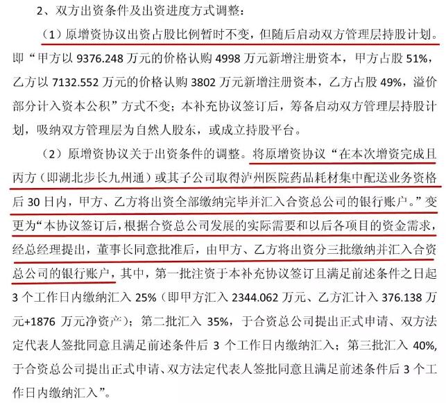 当年12月21日,九州通发布公告称,九州通与步长制药拟以不超过人民币1亿元合作投资医药公司,开展药房托管业务。具体为通过增资已有公司九州通医药集团湖北医药有限公司的方式,拟设立“湖北步长九州通医药有限公司”,作为双方合作开发医疗机构药房托管(药品、耗材、中药等集中配送)业务的平台公司。该公司已完成工商变更登记取得了营业执照。