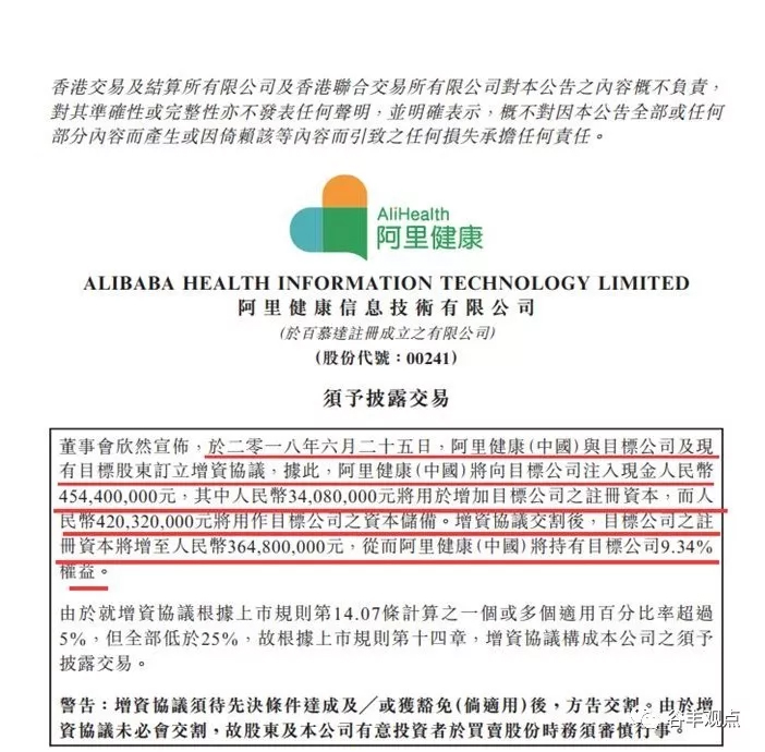 根据协议,阿里健康(中国)将向漱玉平民大药房注入现金人民币454,400,000元,其中34,080,000元用于增加后者的注册资本, 420,320,000元用作后者的资本储备。增资协议交割后,漱玉平民大药房的注册资本将从330,720,000元增至364,800,000元,而阿里健康(中国)藉此将持有漱玉平民大药房9.34%的股权。(透过上述信息可知,漱玉平民大药房的整体估值约为48.65亿元,历史市盈率约为41.2)