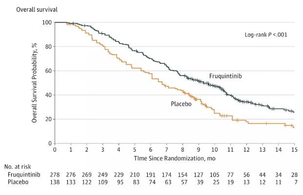 所有患者以2:1的比例,随机分成2组,试验组278名患者,接受口服Fruquintinib治疗,另外138名患者接受安慰剂治疗,两组均联合最好的支持治疗。