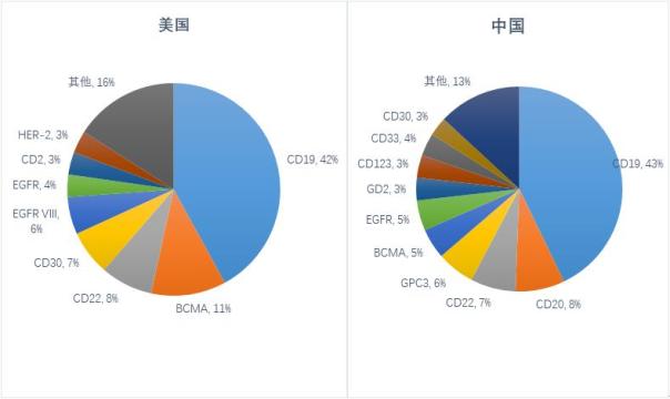 美国和中国在研CAR-T靶点分布