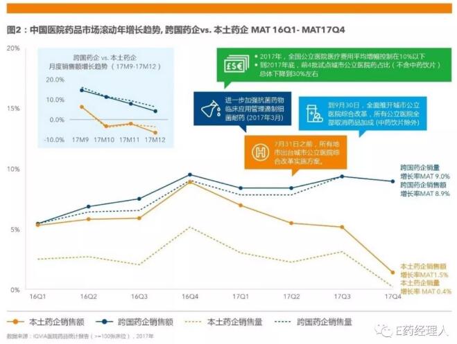 现在网上各种观点满天飞,很多人说政府鼓励仿制品替代,原研药和外企要完。实际上呢,市场数据狠狠地打了这些人的脸(见下图)。就算过外企过专利品种以后会降价,但量也会增长啊,何况外企的新产品管线普遍都很强,现在就看衰外企有点太早吧?中国医药市场的趋势复杂着呢,并不是简单此消彼长。