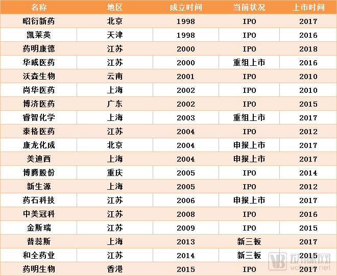 从中可以看到,2015、2016年是这些企业上市的蛰伏期,两年上市的企业共有6家。而到了2017年,CRO企业上市潮开始爆发,这一年成功上市的企业就有5家(并且2016年上市企业中,有两家是11月之后才上市),并且有两家企业在这一年提交了招股书。