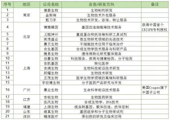 中国作为全球第一个将CRISPR用于人体试验的国家,据统计,已有21家涉及基因编辑的企业,大多数以技术支持和服务外包为主,客户为医疗机构、企业、科研院所与高校等。