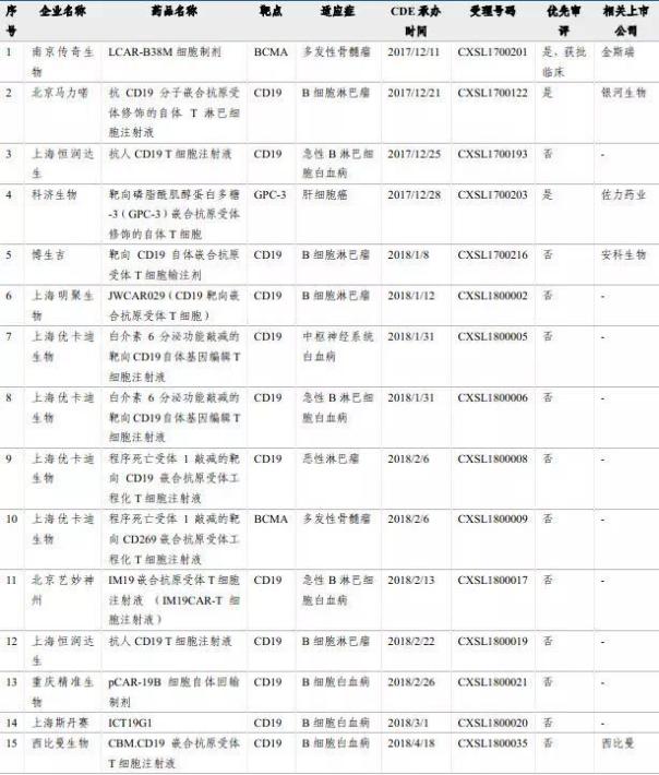 我国临床申请获得受理的CAR-T项目