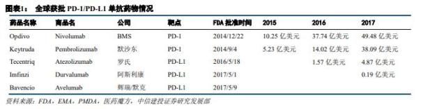目前全球已有5款PD-1/PD-L1药物获批上市,分别为百时美施贵宝Opdivo、默沙东Oeytruda、罗氏Tecentriq、阿斯利康Durvalumab和默克Avelumab。