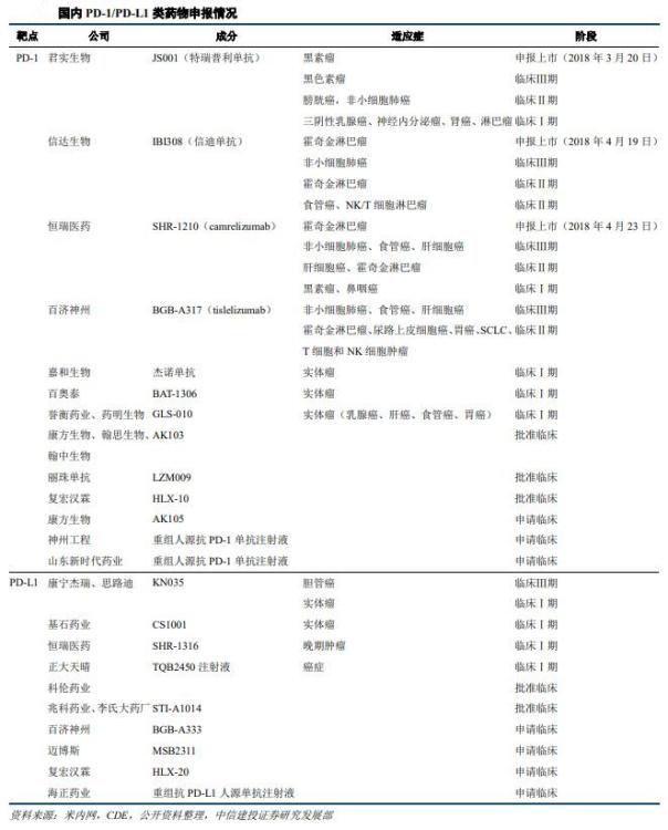 国内PD-1/PD-L1类药物竞争激烈,在研药物有30个,国家药监局公示即将进行或正在进行的临床试验多达60多例。第一梯队为恒瑞医药、信达生物、君实生物和百济神州,前三家均已申请上市,百济神州因国际多中心临床试验,上市进度被延缓。