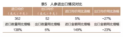 我国既是世界上人参产量最大的国家,又是人参进口国,人参出口情况和进口情况形成巨大反差:进口人参价格约是国产人参的7倍;进口人参价格小幅上涨,而国产人参价格大幅下降;人参进口数量和进口金额同比增幅约150%,国产人参出口数量基本不变,出口额同比下跌23%,突显了我国人参产业的尴尬(见表5)。