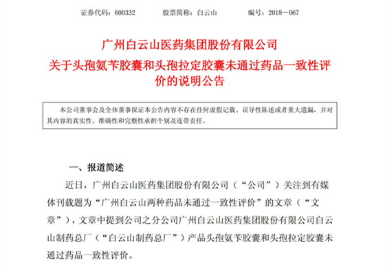 公内容显示,2018年6月25日,国家药监局药品审评中心对于白云山制药总厂申报药品一致性评价的制剂产品头孢氨苄胶囊和头孢拉定胶囊给予“不予通过质量和疗效一致性评价”的评审结果。