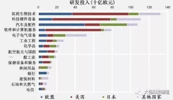 根据欧盟的数据,研发投入排名前11位的行业,医药生物技术居首,当然因为科技硬件设备和软件服务是紧密捆绑的,前面已经说过,所以不能仅凭这一点就说医药生物技术壁垒更高,但医药生物技术中国的相对落后程度更大。