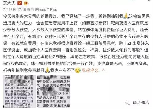 7月18日下午,微博用户“东大夫”发布微博称,自己接到各大公司的轮番轰炸,已经烧了一炷香,祈祷别抽到自己成为新一轮药价谈判的产品遴选专家,并贴出了相关企业“轮番轰炸”信息。根据微博信息显示,“东大夫”目前拥有超过36万的粉丝,其是北京大学肿瘤医院消化道肿瘤内科主任医师。