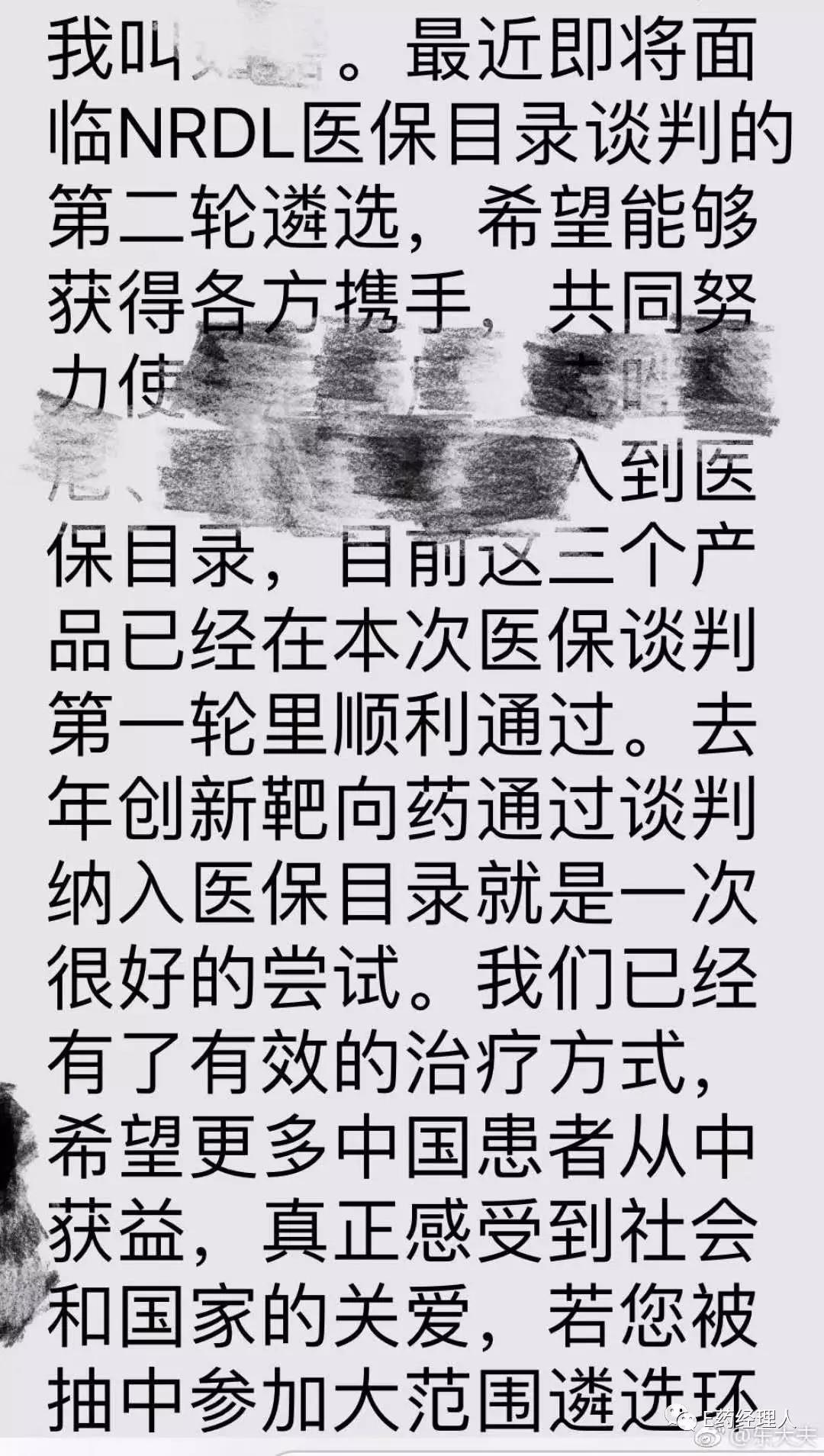 从“东大夫”发布的微博信息显示,目前国家药价谈判已经开始,而且第一轮的筛选也就是国家层面邀约谈判的筛选已经结束,接下来将进入到专家筛选环节。另一个层面显示,该医药企业人事对于公关专家的套路已经十分熟络,在“东大夫”贴出的信息中,该医药企业人员称,“去年创新靶向药通过谈判纳入医保目录就是一次很好的尝试。”