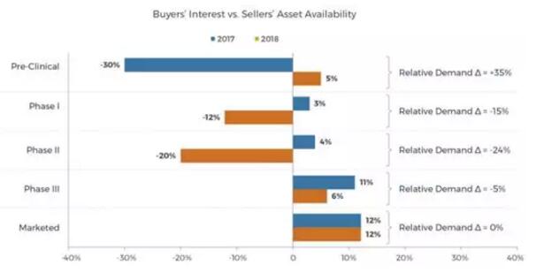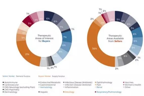 与预期相一致的是,肿瘤治疗仍然是买家和卖家最感兴趣的领域。然而,这一领域的供需差已经从2017年的2%提升到了2018年的15%,这一市场已经开始向着投机市场进行着演化。