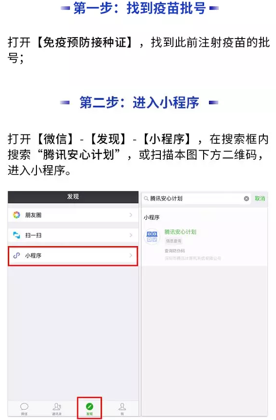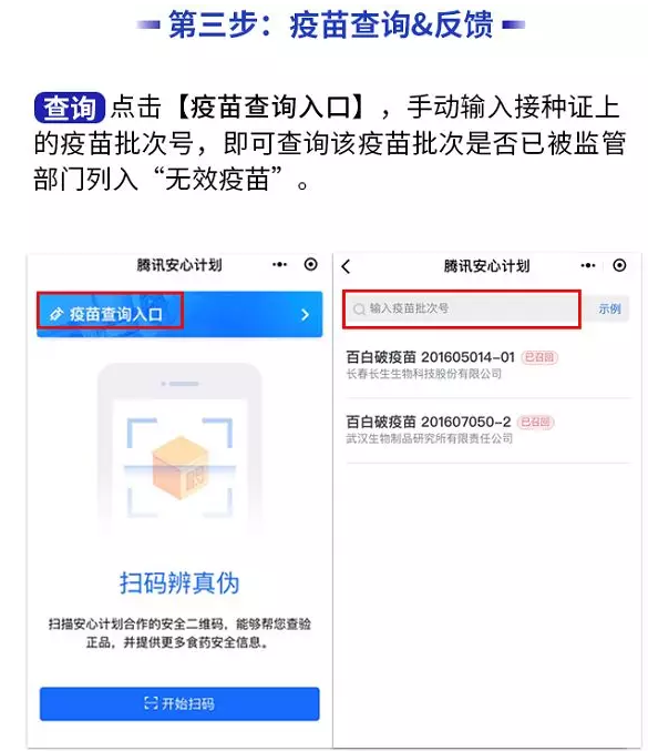 用户进入“腾讯安心计划”小程序后,点击“疫苗查询入口”手动输入接种证上的疫苗批次号,即可查询该批疫苗是否被监管部门列入“无效疫苗”。据提查询方法步骤如下图: