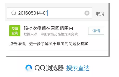 据介绍,用户通过查询,还可以获得包括疫苗批次号、状态、生产企业、有效期、信息来源等信息。另外,用户也可以在QQ浏览器中直接搜索疫苗批号,查询疫苗相关信息。