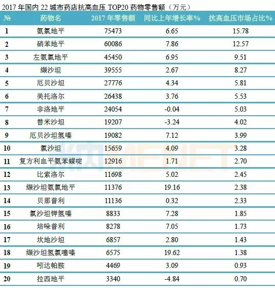 在国内实行慢病门诊转向社区,国家增加医保定点药店和鼓励处方外流的大方向下,国内重点城市公立医院抗高血压药物市场增长进一步放缓,激励了药店抗高血压药物零售市场的活力。