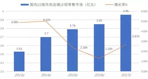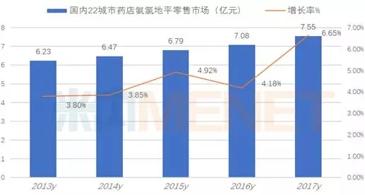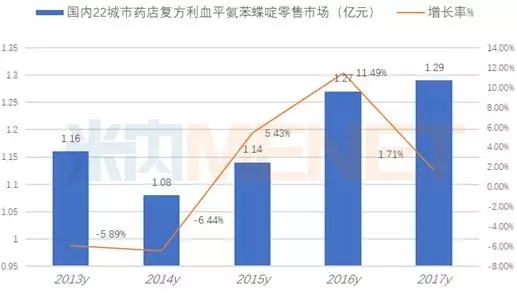 据米内网最新统计数据,2017年国内22城市药店抗高血压药物零售额达到了47.82亿元,同比上一年增长了5.21%,是近五年最高的增幅。