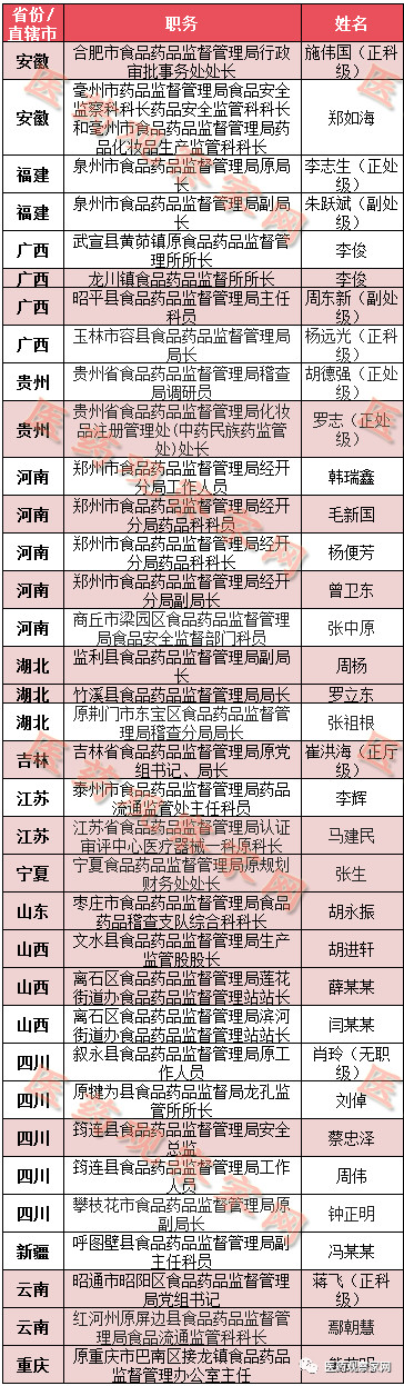 其中局长/副局长有7位,包括吉林省食品药品监督管理局原局长崔洪海(正厅级)、泉州市食品药品监督管理局原局长李志生(正处级)、湖北竹溪县食品药品监督管理局局长罗立东、福建泉州市食品药品监督管理局副局长朱跃斌(副处级)、广西玉林市容县食品药品监督管理局局长杨远光(正科级)、四川攀枝花市食品药品监督管理局原副局长钟正明、湖北监利县食品药品监督管理局副局长周杨。