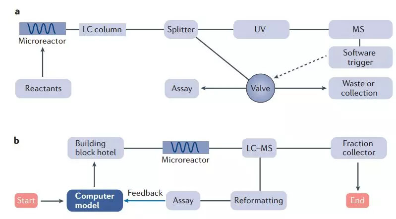 新药发现过程中的一大挑战在于时间成本:许多化学反应耗时较久,而大通量的筛选也势必需要大量时间进行测试。因此,如果能将合成与测试更好地进行联合,就有望进一步提高自动化系统的运行效率。在这篇综述中,作者为我们勾勒出了一幅一体化循环的示意图。这个系统由多个相对独立的功能性元件联合而成,包括了分配器、混合器、反应器、以及检测器等。