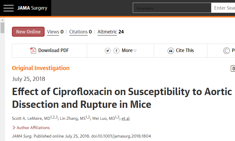 尽管回顾性临床研究指出氟喹诺酮类抗生素与主动脉疾病风险增加之间存在关联,但并没有证明抗生素会导致上述问题。为了确定因果关系是否存在,LeMaire及其同事用小鼠模型研究了人类动脉瘤及其解剖(aortic aneurysms and dissections,ADD)。
