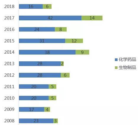 从医药魔方美国库导出近10年(2008/1/1-2018/7/27)首次获批的美国药品,剔除以下品种: