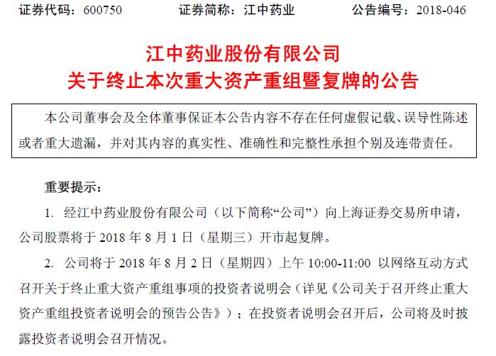 7月31日晚间,江中药业发布公告称,决定终止重大资产重组,放弃收购华润医药旗下的华润江西医药有限公司(下称华润江西)控股权,转为对另外两家企业桑海制药和济生制药的一般收购。