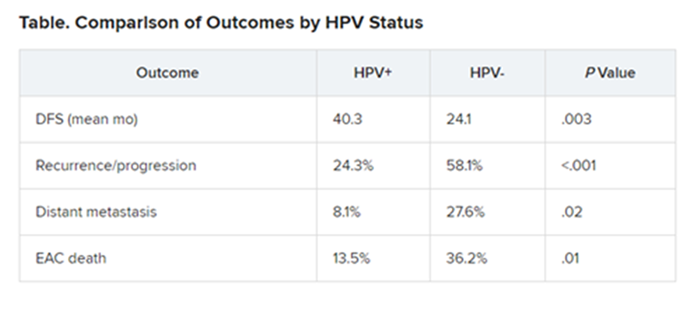 结果显示,HPV阳性患者的无病生存期(从随机化开始至疾病复发或由于疾病进展导致患者死亡的时间,DFS)显着改善。此外,HPV阳性患者的复发/进展率、远处转移和EAC的死亡率都比阴性患者要低,见下表。