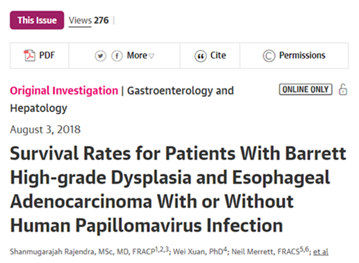 一项新的研究发现,HPV阳性的Barrett高度异型增生(HGD)或食管腺癌(EAC)的患者预后比HPV阴性的患者更好。该研究于8月3日在线发表于JAMA Network Open。
