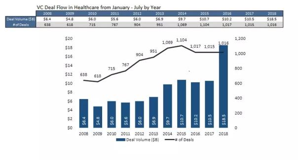 今年7月,获得融资的医疗初创企业有134家,融资金额总计24亿美元。自2008年以来,没有任何一个月份能够达到这一融资规模。2017年同月,虽然有146家初创医疗企业获得了融资,但是成交金额却只有16亿美元。截止到2018年7月末为止,风险投资机构已经累计向初创医疗市场投入了185亿美元,这一规模较2017年同期上涨了75%。