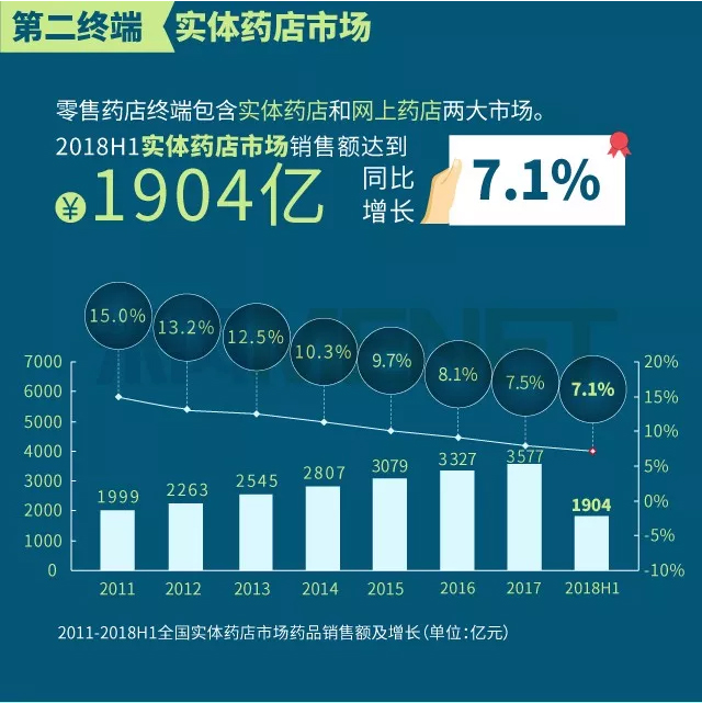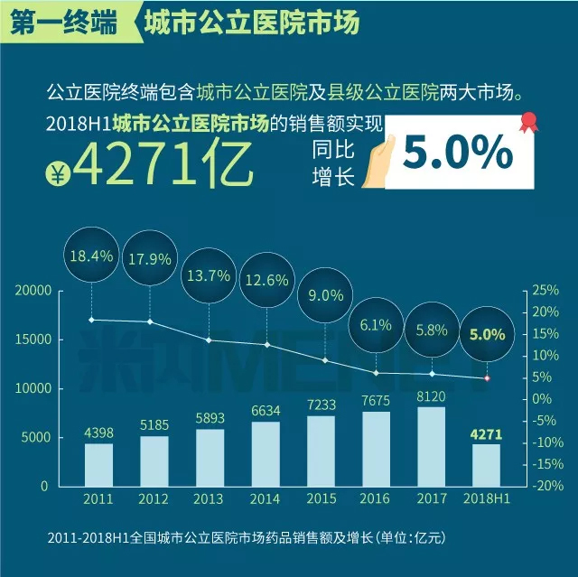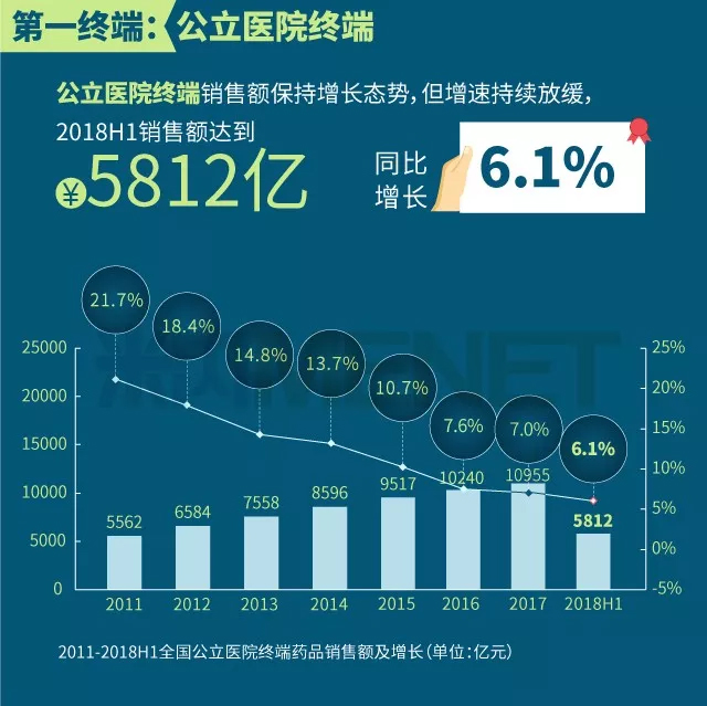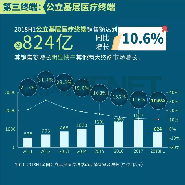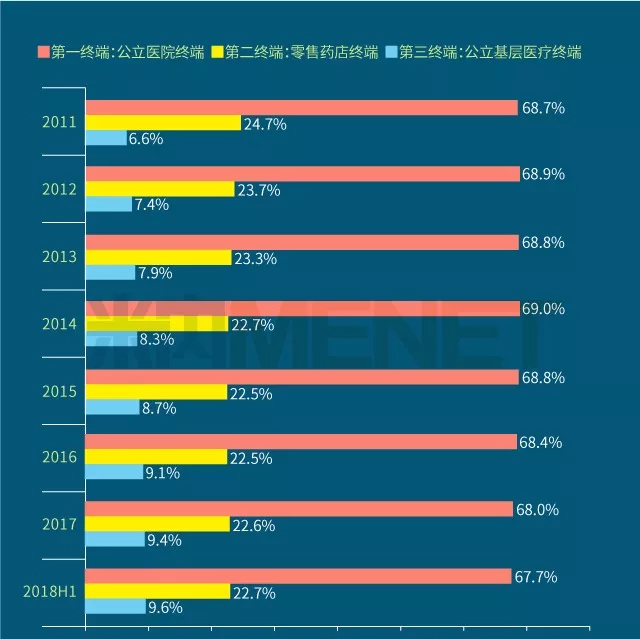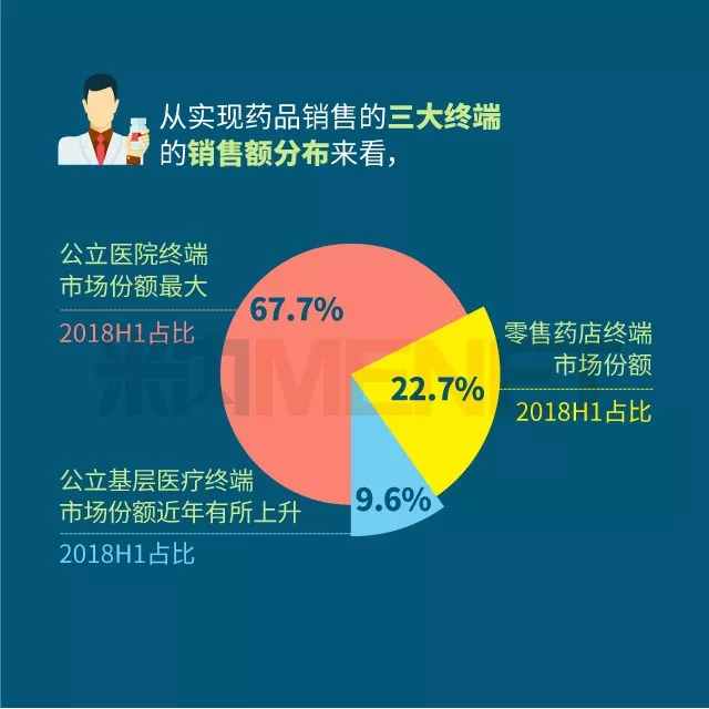 2018年上半年我国三大终端六大市场(定义范围详见文末“数据说明”)药品销售额实现8590亿元,同比增长6.9%。从实现药品销售的三大终端的销售额分布来看,2018年上半年公立医院终端(包括城市公立医院及县级公立医院两大市场)市场份额最大,占比为67.7%,零售药店终端(包括实体药店和网上药店两大市场)市场份额占比为22.7%,公立基层医疗终端(包括城市社区卫生中心/站及乡镇卫生院两大市场)市场份额近年有所上升,2018年上半年占比为9.6%。以上统计数据未包含“民营医院、私人诊所、村卫生室”。